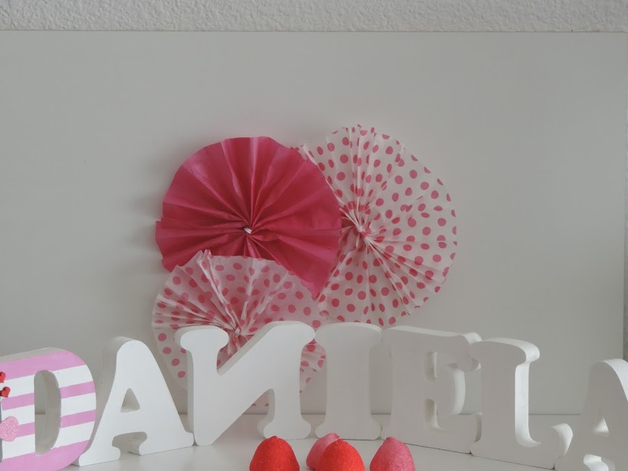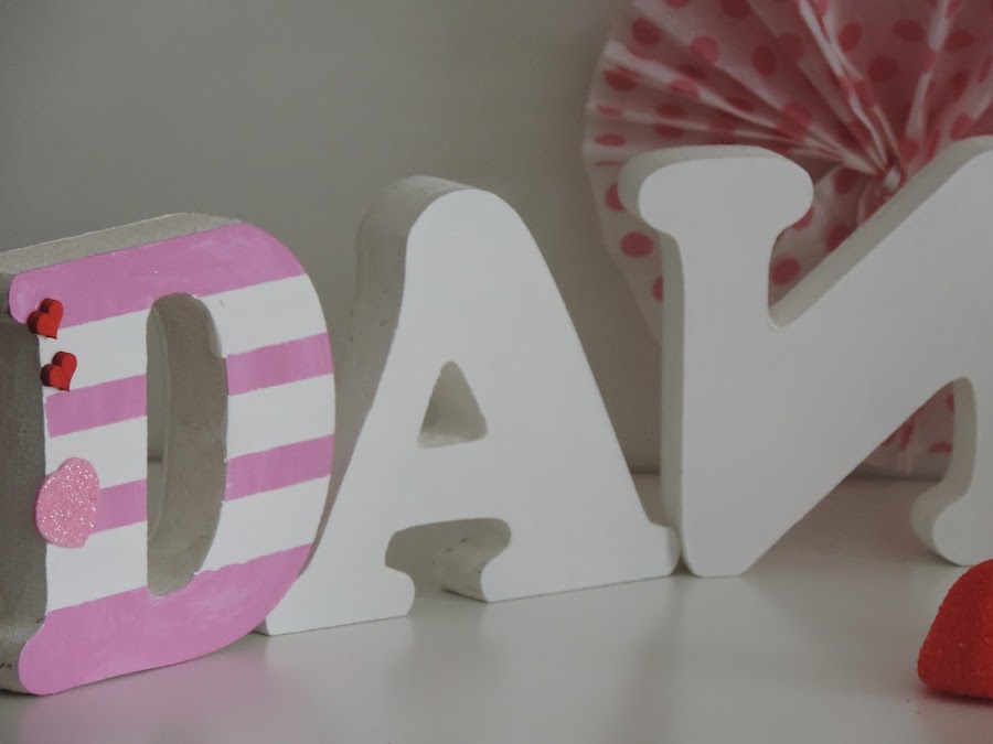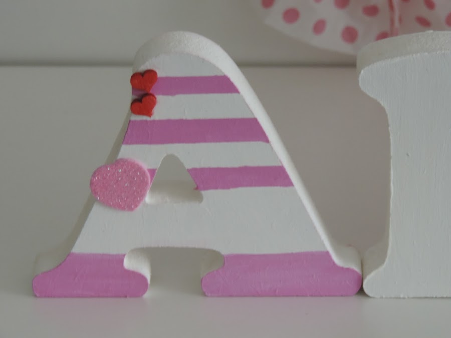 En el caso de los nombres de niña lo que hice fué primero pintar las letras todas de blanco y una vez secas apliqué whassi tape haciendo las rayas deseadas y pintando de rosa sobre el blanco y una vez secas apliqué cera incolora y puse unos cuantos corazones como adorno final.....