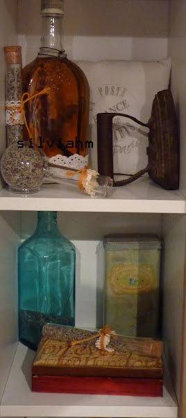 Y, por último, una idea encontrada en Pinterest: Unos tubos de ensayo y un matraz de cuando mi marido estudiaba llenos de lavanda y decorados con puntilla y un lazo de cuerda.