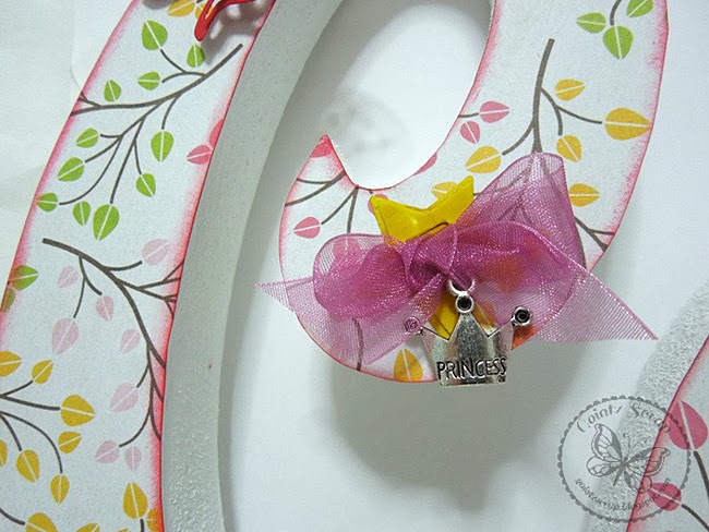 En la letra C hay una estrella entintada con Distress Ink - Mustard Seed, a la que le he colocado un lazo de organza rosa y del que cuelga un charm en forma de corona con la palabra "Princess", ya que como imagino, será la princesa de la casa :)