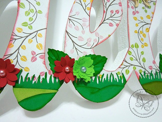 Hierba por toda la parte baja, son los troqueles "Fresh Cut Grass" de Die namics y "3D Grass" de Quickutz / Lifestyle Crafts. Además, tiene los bordes entintados con tinta Distress Ink - Mowed Lawn.