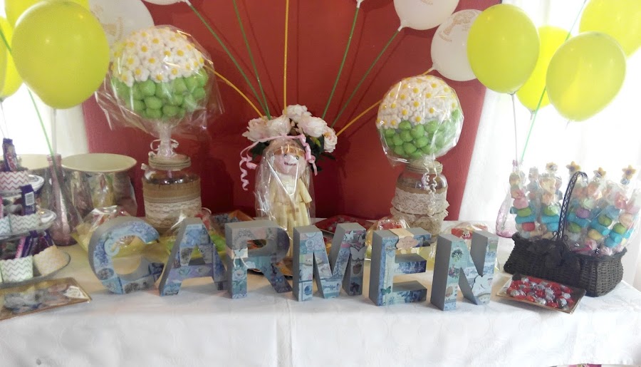 Todo lo que tiene la mesa, todas las chuches, los adornos, la muñeca, los globos...todo!! Hecho por Rita, la otra madrina de Camencita. Fijaros en los árboles con las flores...qué bonitos!!
