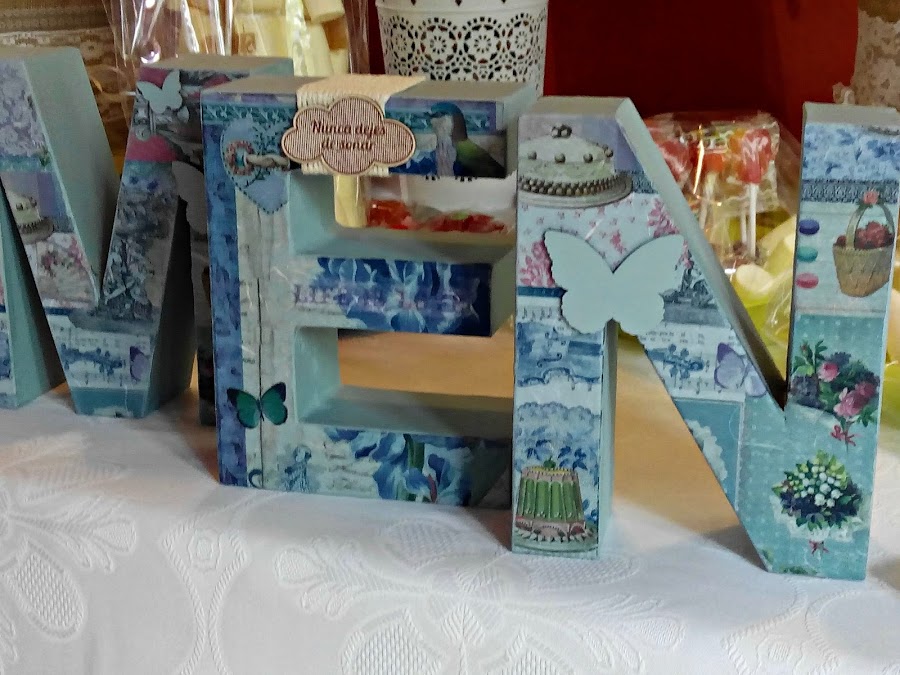 En la parte frontal de cada letra, pegué un papel de arroz muy bonito, en esos tonos, con flores, mariposas y referencias a "Alicia en el país de las maravillas", usando la técnica de decoupage.