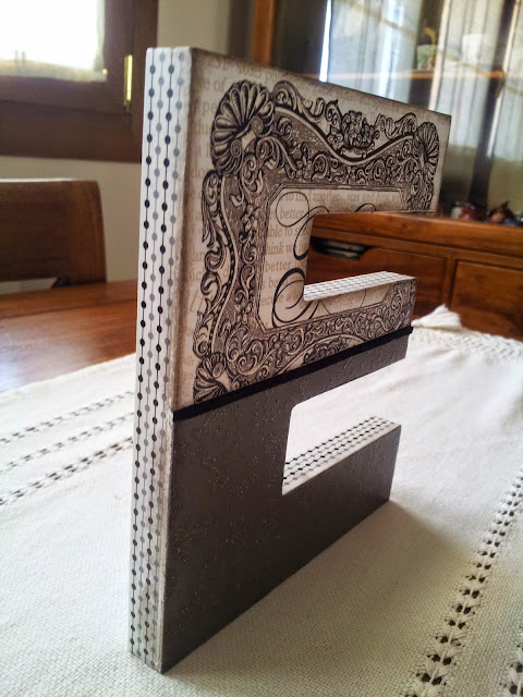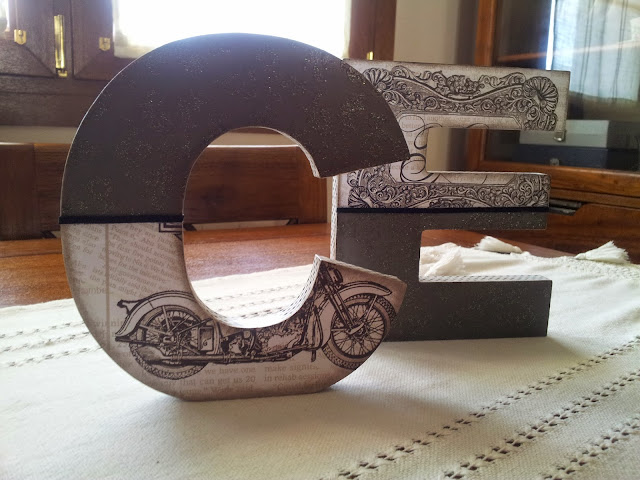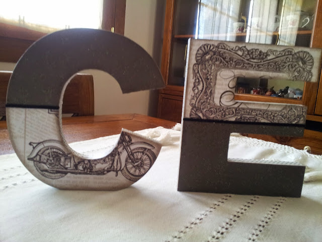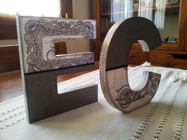 Para decorarlas he utilizado papel de scrap y papel de decoupage, el papel negro tiene un relieve precioso ( no se aprecia demasiado en la foto) y para diferenciarlos una cinta de antelina en negro y