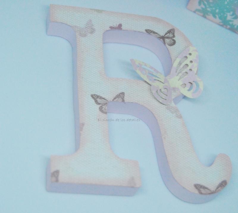 La «R», al decorarla con un papel de mariposas, le puse una mariposa troquelada