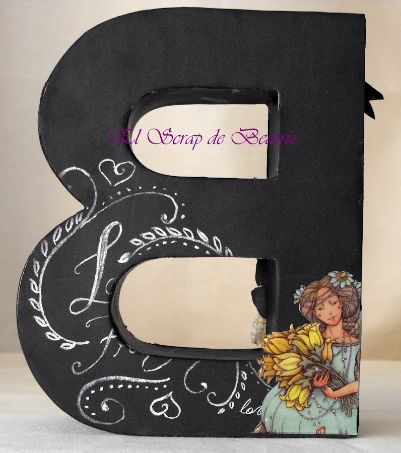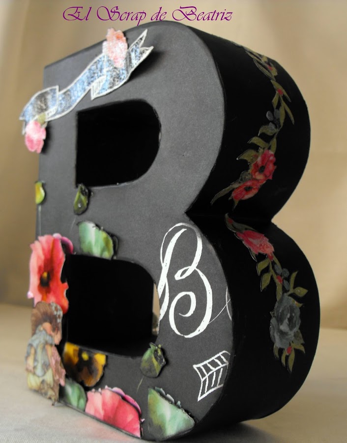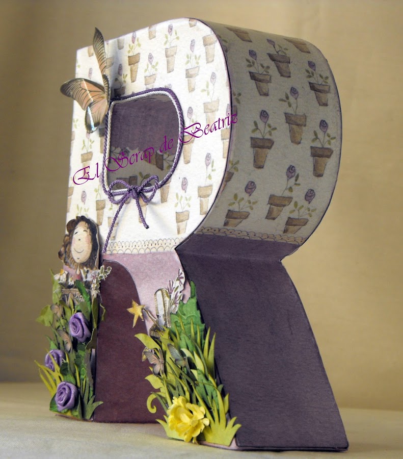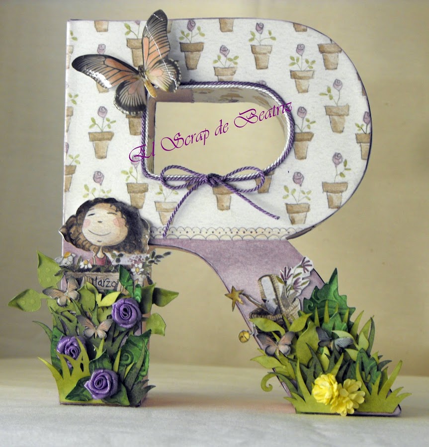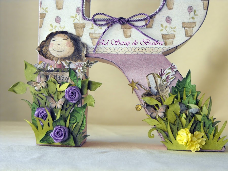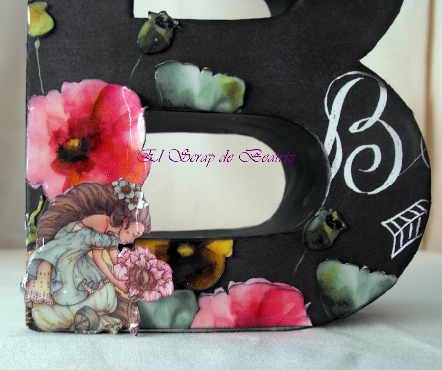 Esta letra el papel trae las flores que se ven, pero para darle volumen, de otra hoja igual recorte las mismas flores le eche glossy y las puse encima pegadas con foam, la muñeca es de la colección Fairy Tale de Scrapberry.