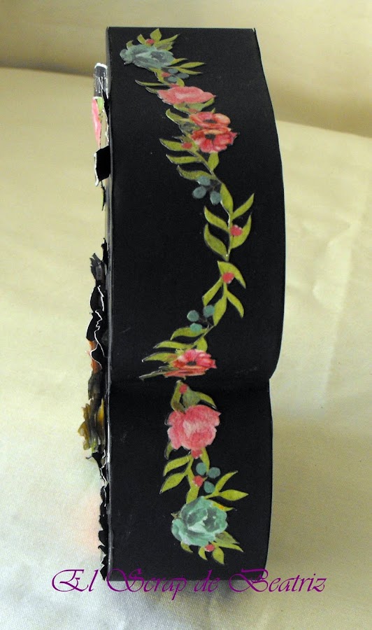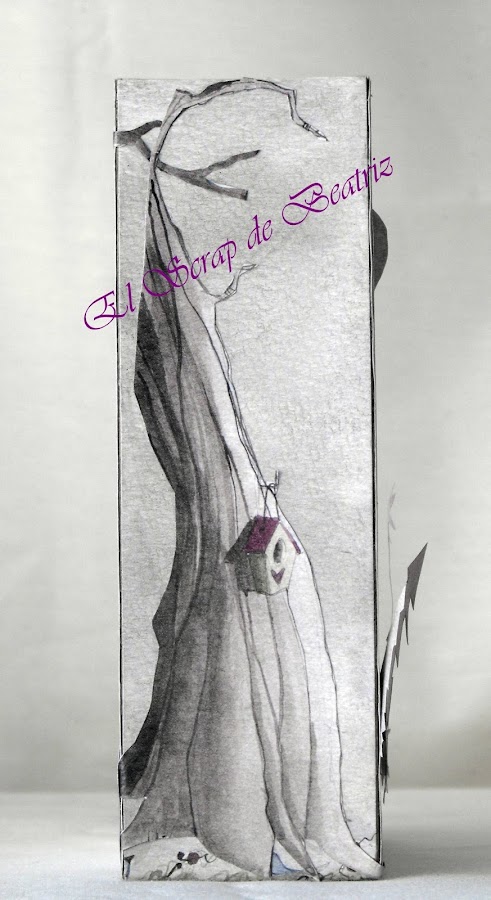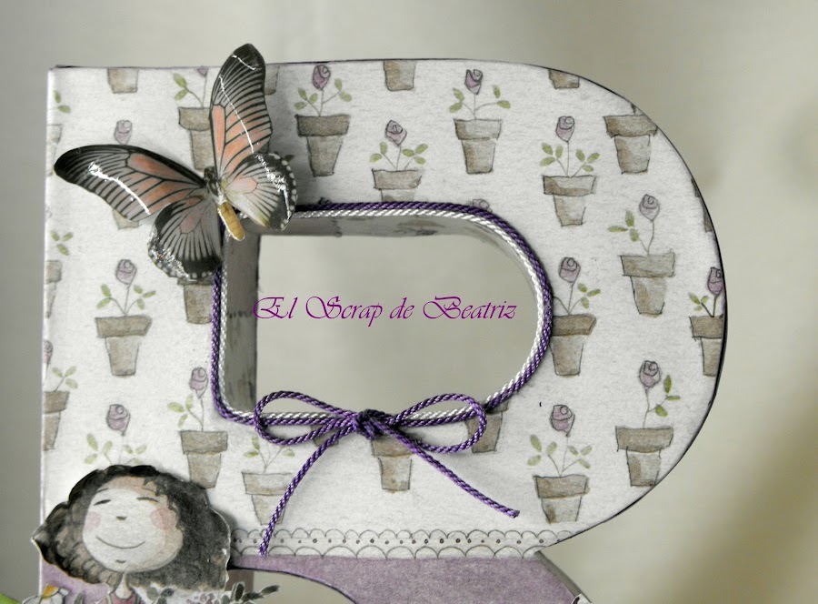 Al igual que la anterior marco la letra recorto y pego, alrededor del hueco le he puesto cinta de ratón finita de dos colores, blanca y malva, he echo un montaje con hojas, ramas y flores y las he pegado con foam para que sobresalgan la muñeca tambien esta con foam pegada.