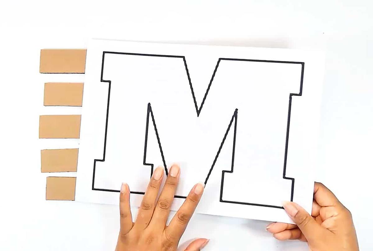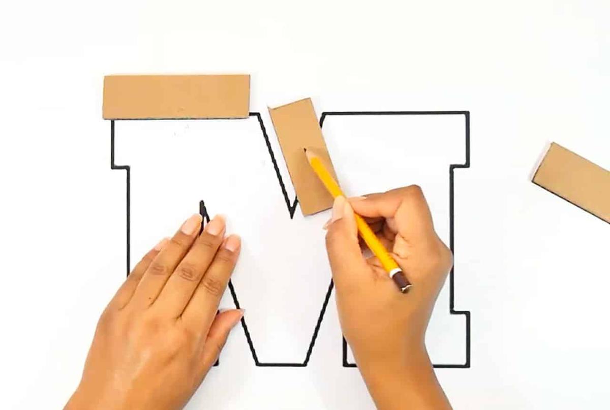 Con todas las figuras y piezas de tubos de cartón listas, podemos comenzar a pegarlas en la letra. Explorar diferentes patrones y distribuciones según tu preferencia.