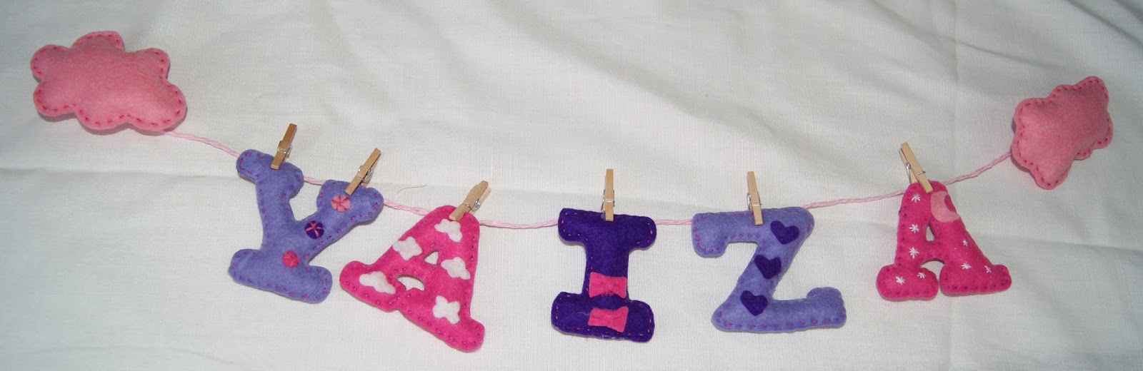Ya os comenté ayer en Facebook, que hoy el blog iba a llenarse de mariposas. Los nombres de fieltro que os presento hoy, además de tener en común que las figuras laterales que los componen son mariposas, también se caracterizan por ser nombres de niñas diferentes y originales. El primero es Yaiza. Nombre de origen canario, que por lo que he podido averiguar significa arco iris, princesa del sol o ...