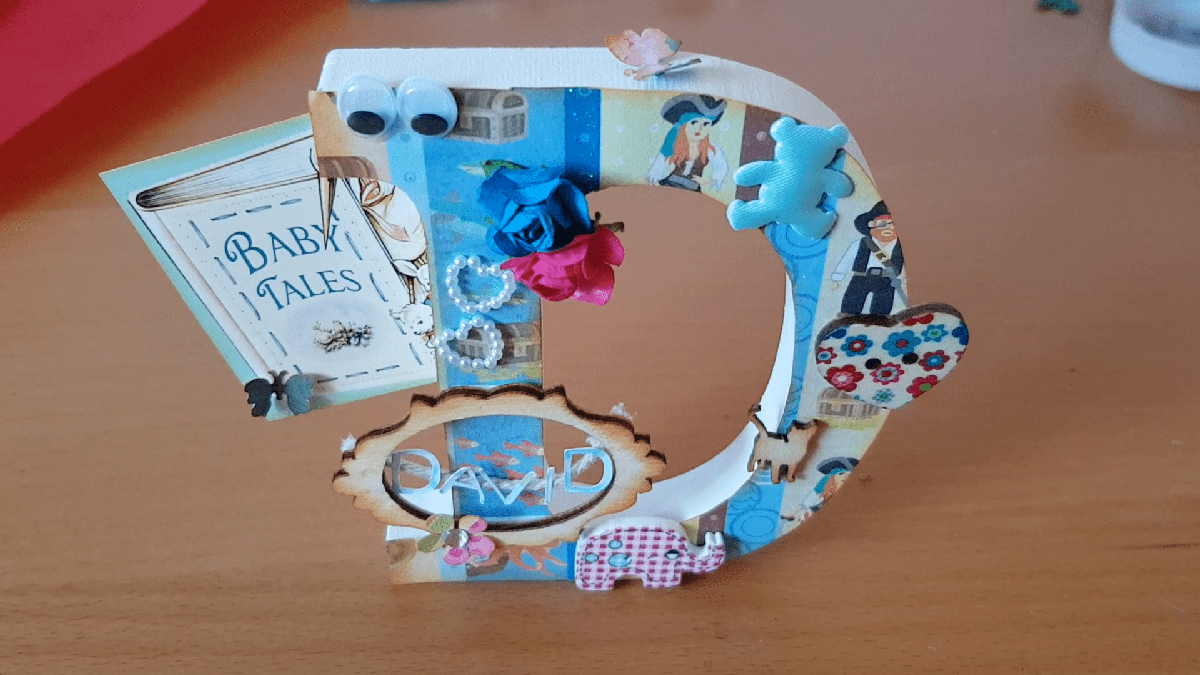 5. Este es el paso que más me gusta, tenemos que elegir todos los adornos que mejor combinen con nuestras letras, a mi a las letras infantiles siempre me gusta ponerles ojos, pero eso es a vuestro gusto mariposas, botones, flores, animales…hay un sin fin de posibilidades.