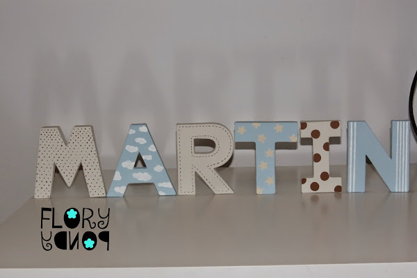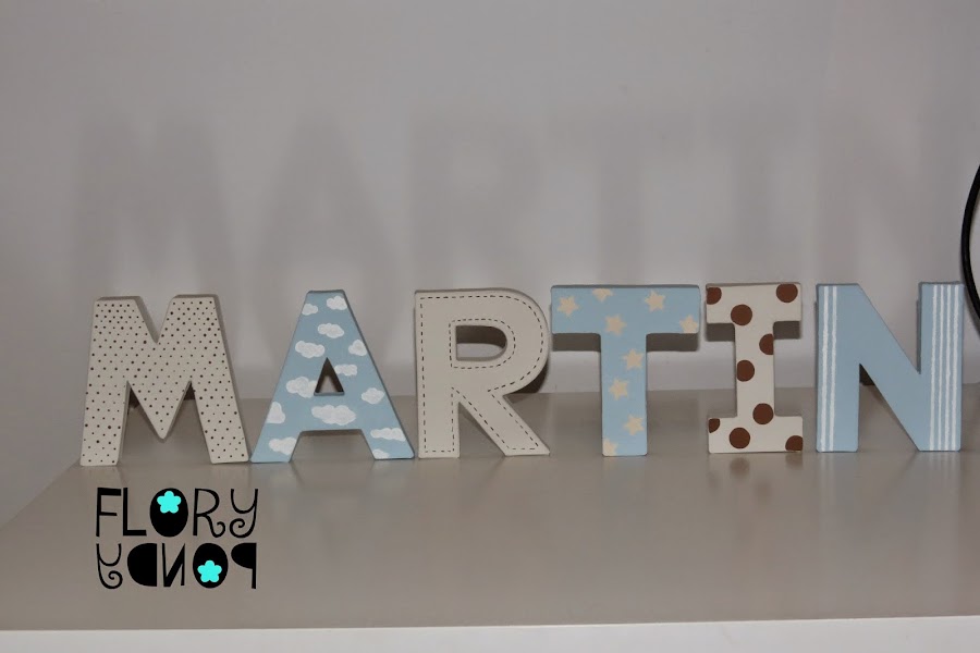 Las letras las podéis encontrar en cualquier tienda de manualidades, o por ejemplo en Leroy Merlin , Bricor, estas son compradas en Bricor. Había dos tamaños unas de 22 cm aproximadamente y otras de 12 cm, esto tenéis que mirarlo bien porque si las vais a poner en una estantería y escogéis las grandes,pues igual no os caben, porque claro no es lo mismo llamarse Martín , Alejandro que Ana o Teo.