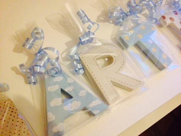 Luego para decorar ya con un poco de imaginación , a una letra le pinté rayas, a otra estrellitas, a otra nubes... esto ya con pintura acrílica, yo suelo usar la marca Americana. Y después de dedicarle unas horitas conseguimos lo siguiente:
