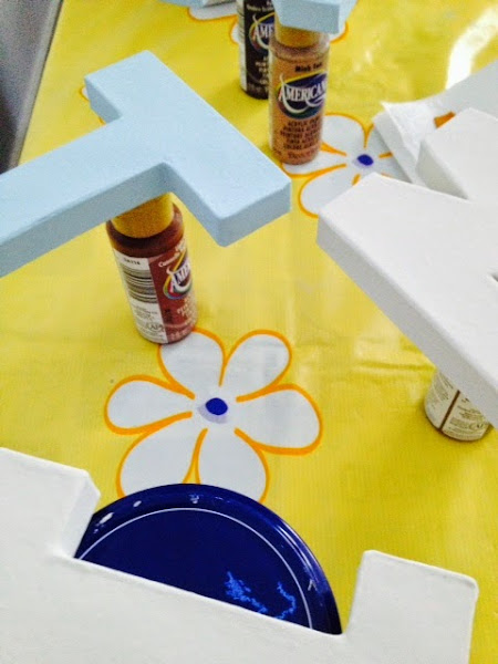 Mi amiga quería que las letras llevaran los colores de las paredes de la habitación, así como había pintado la habitación recientemente, me dejo pintura,le dí varias manos a cada letra hasta que quedaran bien cubiertas y uniformes.