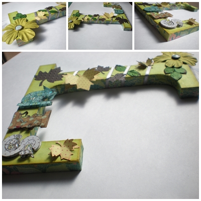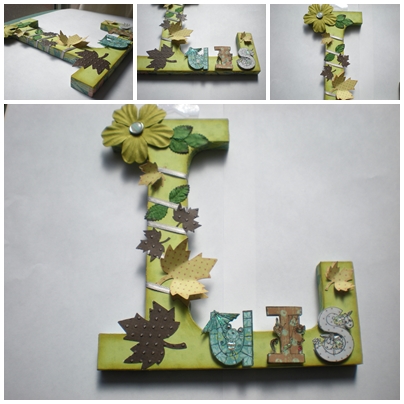 Esta otra letra la decore usando hojas creadas del mismo modo que en la anterior además emplee una flor en cuyo centro hay un pebble, una cinta de raso estrecha (3mm) a modo de enredadera y hojas verdes mas pequeñas , las letras están elaboradas de modo idéntico a las de la otra letra .