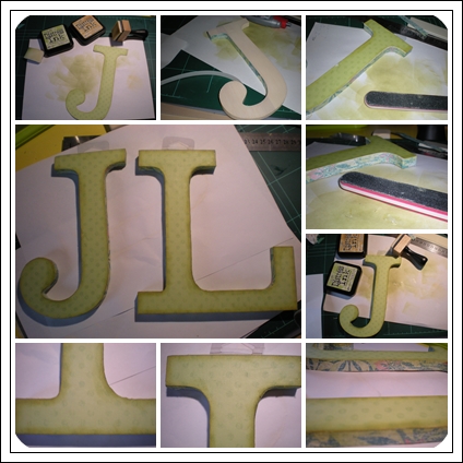 Luego entinte con distress de varios tonos, recorte unas tiras que se adaptaran al contorno de las letras, estas tiras son las primeras que pegué y a continuación pegué la silueta de las letras, con una lima limpie los cantos para que estos quedaran más limpios y sin imperfecciones, y volví a entintar en varios colores de distress los cantos.