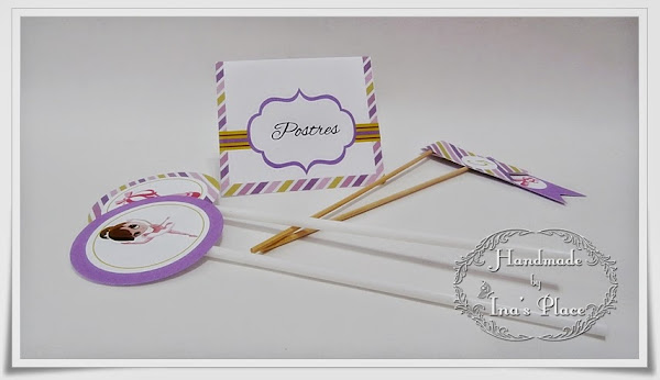 Aquí pueden observar el cartel para la mesa de postres y banderines para las bebidas.Todo a juego con la invitación.?