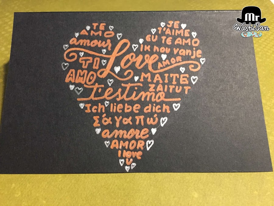 Utilizando un rotulador metalizado escribiremos las palabras AMOR y TE AMO dentro de la forma de corazón en 10 diferentes idiomas y tipos de escritura. Usamos un rotulador en color cobre que contrasta mucho con el fondo negro. Llenamos el corazón de palabras de amor y los huecos que queden los llenamos con corazones plateados.
