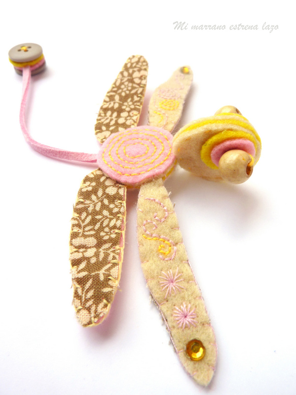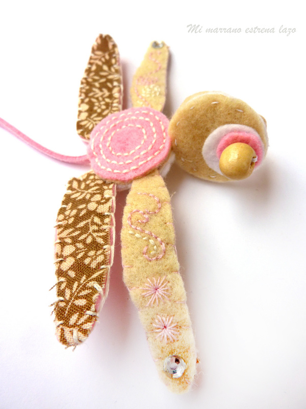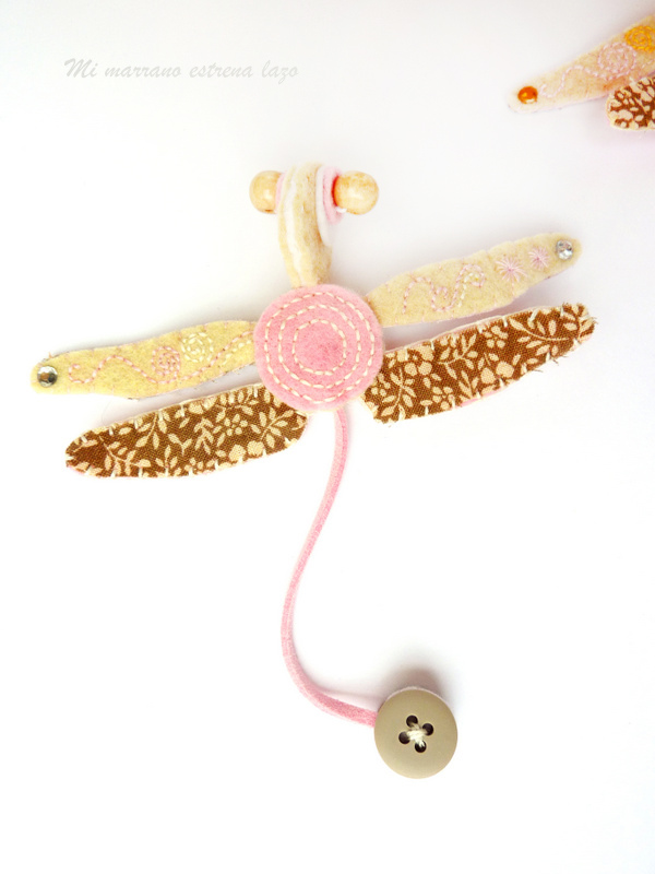 Como veis los colores que tiene son beige, canela y rosa, pero después una de ellas tiene amarillo y la otra blanco, lo hice porque no sabia con cual quedaría mejor, y dije, pues ale! lo hago con los dos colores, del blanco y el amarillo tiene muy poco, pero son muy importantes, son el bordado de las alas delanteras(junto con el rosa) y del cuerpo, parte de los discos de fieltro de la cabeza y el cuerpo, y las dos piedrecitas que hay en los extremos exteriores de las alas, que le dan un aire más sofisticado ;) las cuentas de madera son beige también, y la cola es una tira de cuero rosa. La parte de abajo de las alas son de fieltro rosa y de la misma tela canela de las alas traseras. Para terminar el final de cola lo forman dos discos de fieltro rosa y amarillo o blanco y dos botones canela, las medidas aproximadas: 12,5 de largo por 11 cm de ancho en las alas.