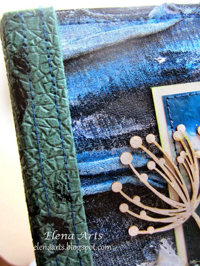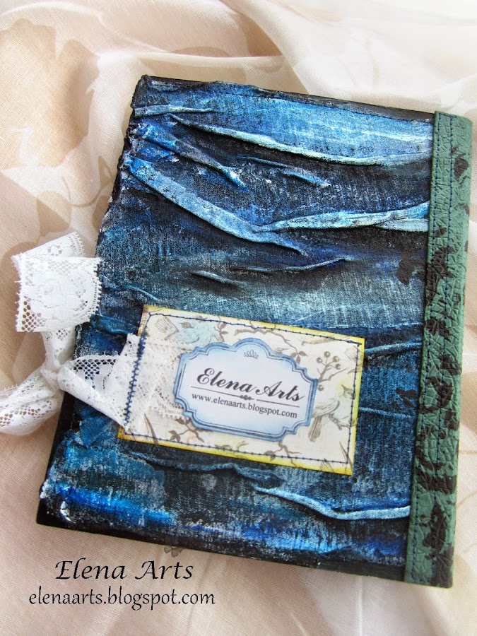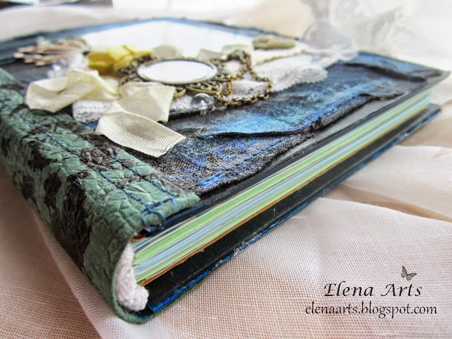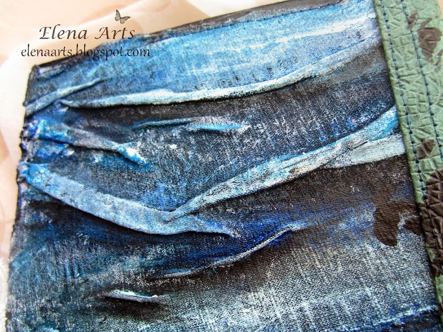 Bueno, y ahora un poco de detalles de la libreta. Las tapas están forradas de tela vaquera, cubiertas parcialmente con gesso blanco y repasadas con pintura acrílica.