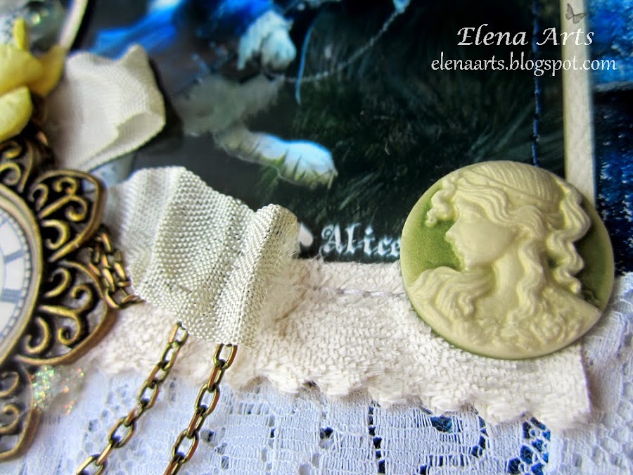 El reloj es un cameo metálico. Imprimí una esfera de reloj, la recorté y la cubrí con el glossy accent transparente, imitando a cristal. Añadí unas cadenas y hecho.