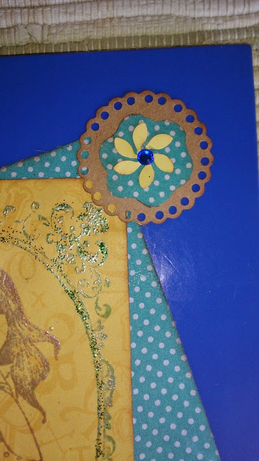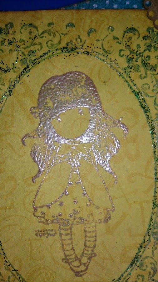 Estampé en un papel Scrap el sello de la muñequita Gorjous y practiqué un embossing en caliente sobre la figura y quedó una muñequita brillante y cuquísima. Le añadí a la libreta las letras troqueladas de Ainhoa en madera de pino y decoradas con purpurina verde sobre una tela adhesiva de topitos en color fondo azul turquesa que resaltaba sobre el azul oscuro de la libreta. Y por último le añadí una flor troquelada con un brillante azul oscuro.