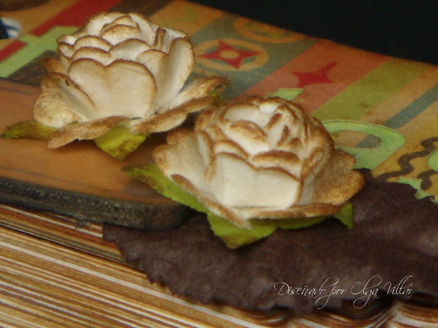 Unas florecillas y hoja marrón de "I am roses", perlita verde, y lazos de organza, son los adornos utilizados para este caso.