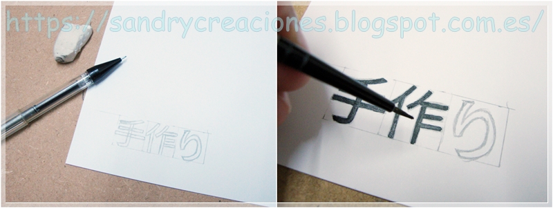 Paso 5. Buscar la frase "Hecho a mano" en japonés y pintarla en una cartulina blanca con pintura acrílica negra. En nuestro caso no nos veíamos preparados para hacer los símbolos japoneses sin una guía, así que primero nos hicimos una pequeña cuadricula de 1,5 cm de altura por 4,5 cm de longitud que dividimos en tres cuadros de 1,5 x 1,5 cm para así tener un recuadro para cada símbolo y hacerlos proporcionados. Luego dibujamos los tres símbolos y seguidamente fuimos rellenándolos con pintura acrílica negra. Una vez seca la pintura con una goma borramos el lápiz y pasamos al siguiente paso.
