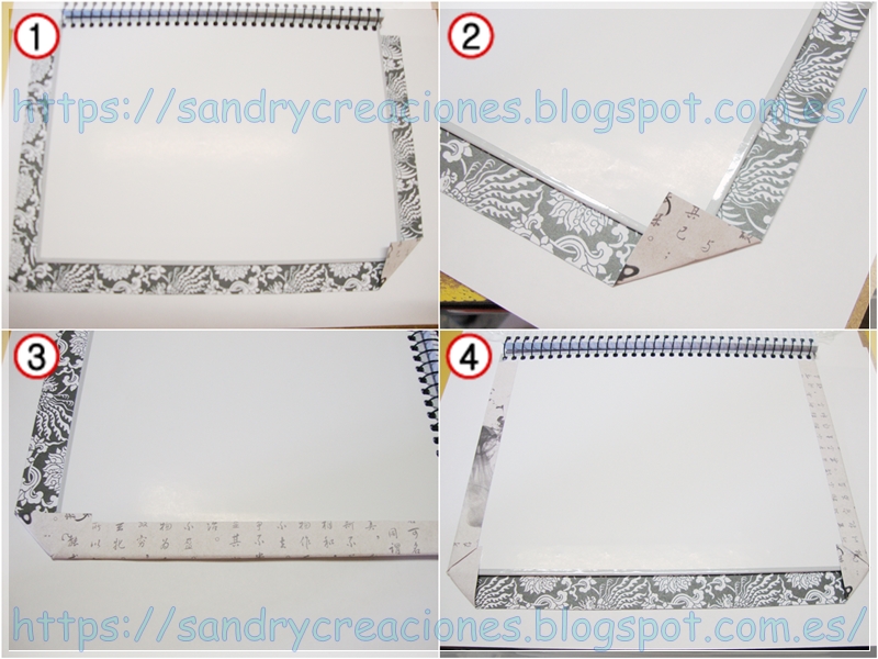 Paso 3. Pegar y doblar los márgenes de la portada y contraportada hacia el interior. Para hacerlo, primero de todo doblamos y pegamos con cola para decoupage las puntas (imágenes 1 y 2) y seguidamente vamos doblando los márgenes y pegándolos con cola decoupage (imágenes 3 y 4).