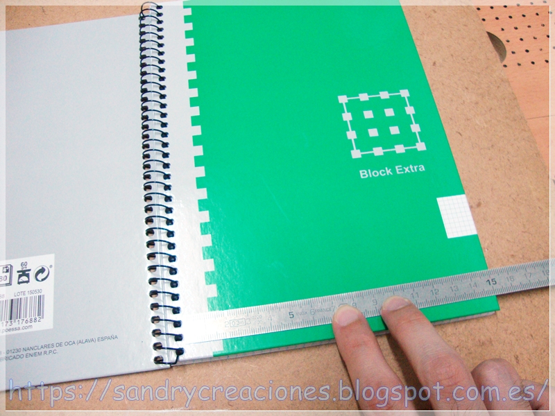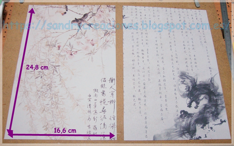 En nuestro caso la libreta media 15,1 cm de ancho por 21,8 cm de alto y dejando los márgenes de 1,5 cm en tres de los lados cortamos dos trozos de papel de 16,6 cm de ancho por 24,8 cm de alto: