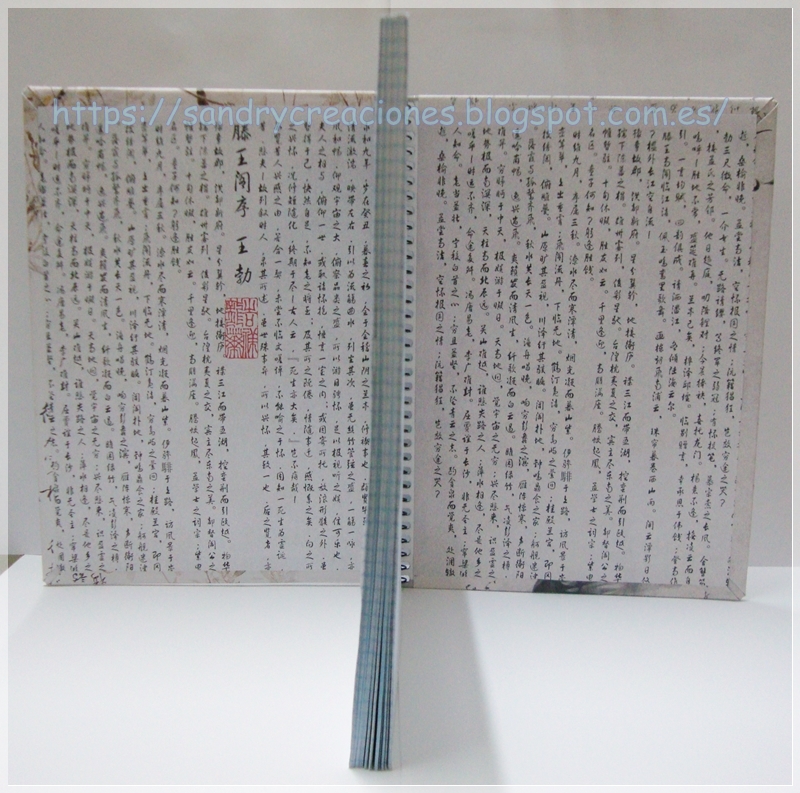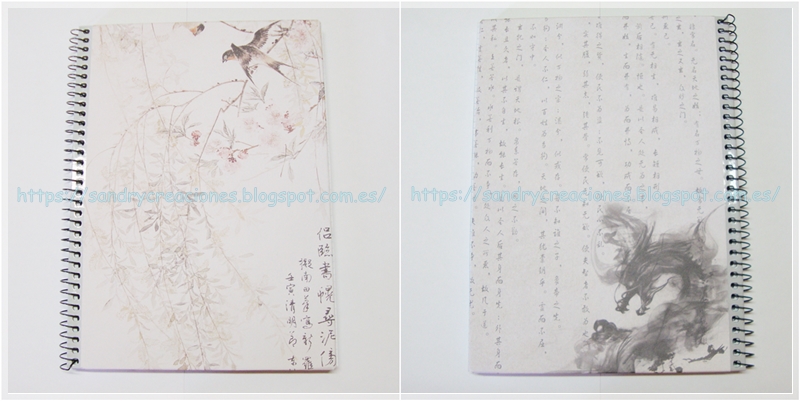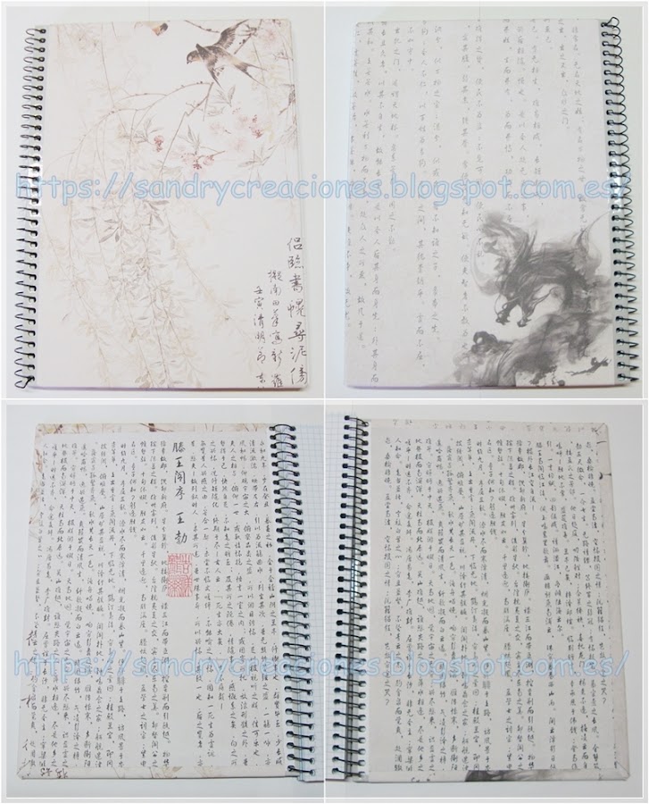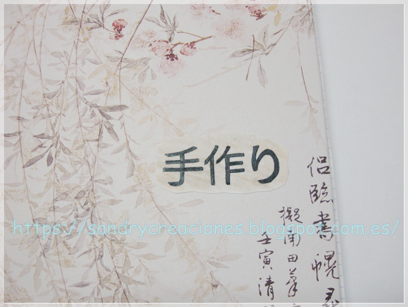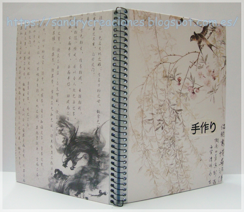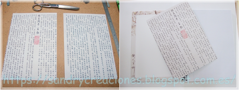 Hace tiempo que teníamos ganas de decorar alguna libreta y el hecho de que necesitáramos una para seguir diseñando nuestras creaciones, porque se nos había terminado la anterior, nos motivó a hacerlo. No sabíamos muy bien como decorarla pero se nos encendió la bombilla cuando vimos el nuevo reto amistoso propuesto por Maria José del blog "La libélula que reinventa tus trastos" que consistía en Oriente. Al ver ese tema nos acordamos que hace algún tiempo habíamos comprado papeles decorados con motivos orientales y que de momento no habíamos utilizado y que esta sería la ocasión perfecta para utilizarlos. Así que nos decidimos por decorar la libreta con estilo oriental con la frase "Hecho a mano" escrita en japonés y todo.
