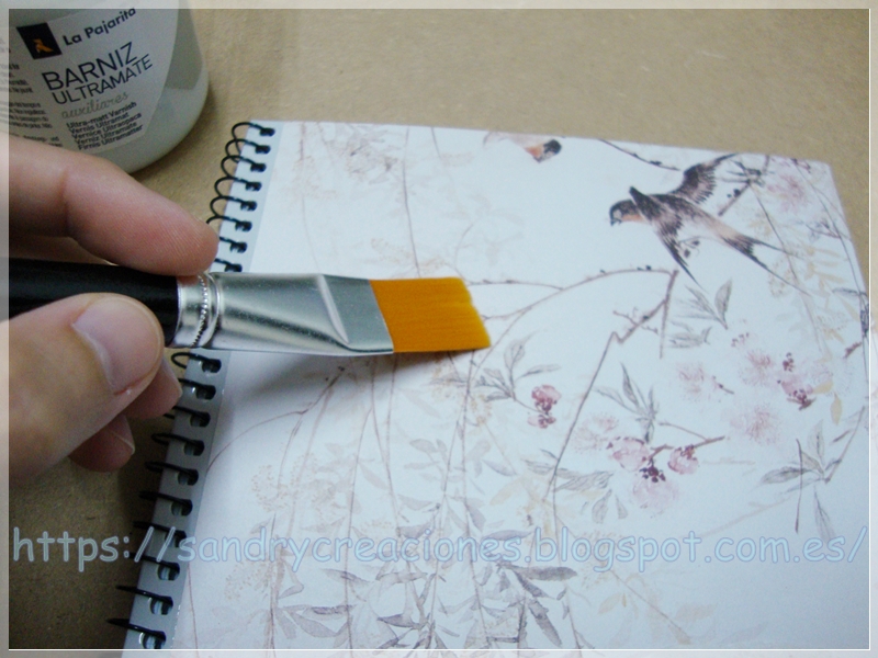 Paso 8. Aplicar una capa de barniz mate a la libreta. Una vez puestos todos los elementos decorativos a la libreta y para darle el toque final y protegerla dimos una mano de barniz mate por toda la portada, contraportada y sus interiores.