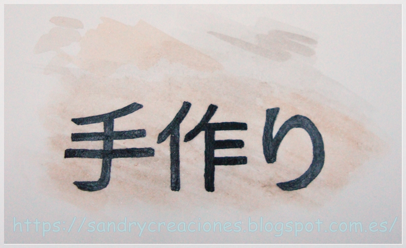 Aunque así y dándole una mano de barniz mate ya la hubiéramos podido dejar por terminada nosotros queríamos algo más y pensamos en porque no le pintábamos algunas letras o alguna palabra relacionada con el contenido que queríamos poner en la libreta, y se nos ocurrió la frase "Hecho a mano". Así que nos ayudamos del traductor de google y de varias páginas en Internet para saber cómo se escribía en Japonés y una vez supimos cómo se escribía nos pusimos con el siguiente paso.