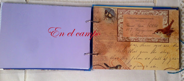 Hola a todos. Hoy os enseño esta libreta apaisada que he hecho, encuadernada con anillas. Le he dado un toque escrapero (pero bastante moderado): la portada y contraportada son con cartón de encuadernar, y el cierre es un brad muy mono en tono azul agua, al que se ata un fino cordón en azul turquesa. El papel de mariposas, flores y pájaros me parece una preciosidad. Le he puesto anillas porque así se pueden añadir y quitar hojas cuando queramos.Las esquinas tienen esquineras plateadas, y encima (aunque no se aprecie en la foto), para proteger el papel, he añadido un acetato transparente.