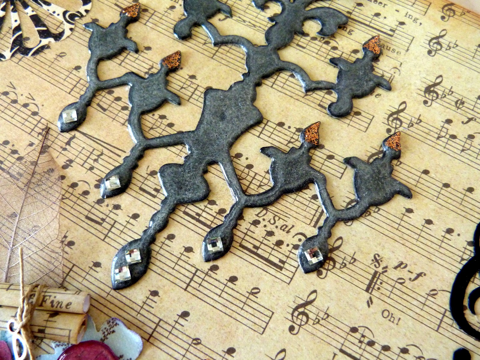 El candelabro es también un troquel de Sizzix (Chandelier) y para darle este aspecto de plata envejecida lo corté en cartón negro, embosé una primera vez con polvos plateados y después dos capas de utee.