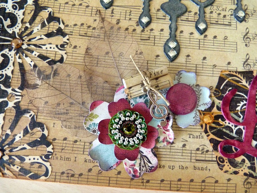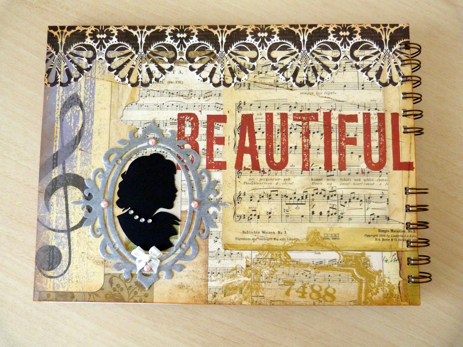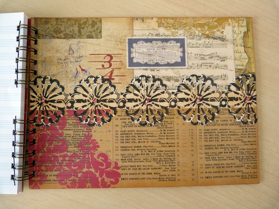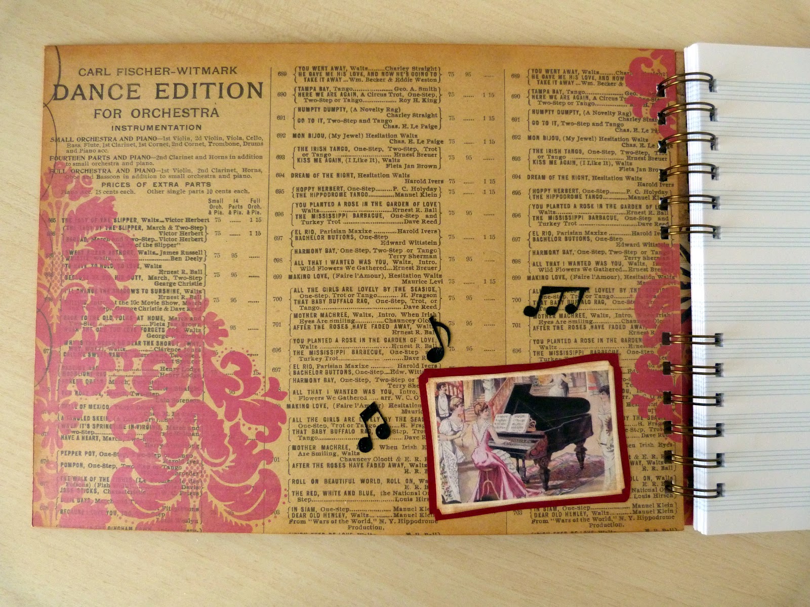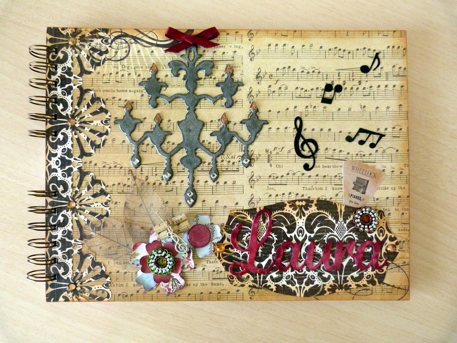 No las he querido adornar demasiado para no aumentar el volumen de la libreta, simplemente unas notas musicales, una imagen de la red y en la trasera otra vez el troquel Daisy Fan pero esta vez doblado, lo que le da una apariencia de cenefa de flor.
