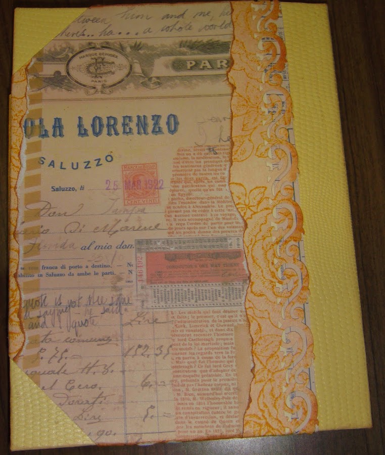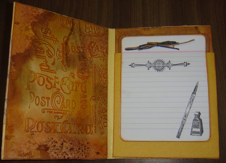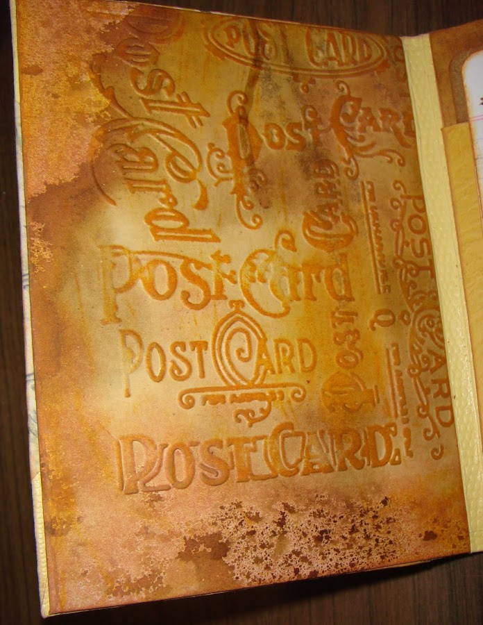 La hoja embosada de la parte trasera de la portada está entintada con dos colores de distress nuevos para mí como son distress rusty hinge y wild honey. Luego embosada con una carpeta de Tim Holtz llamada texture fades embossing folders Postcard and Sheet music set (por si alguien se enamora).