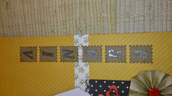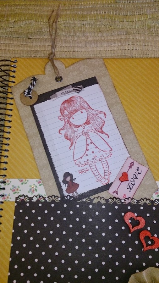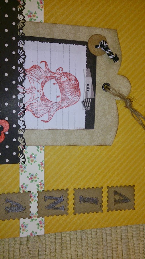 He forrado tanto la portada como contraportada con papeles scrap de la colección Gorjous. He confeccionado un bolsillo troquelado en el borde superior para introducir una tag o etiqueta especial supergrande con la muñequita Gorjous estampada. He troquelado en una guillotina de bordes un papel craft para hacer unos seudo sellos en los que he estampado cada una de las letras de la niña destinataria de la libreta.