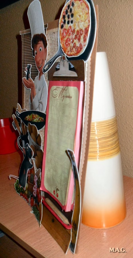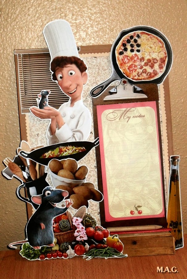 Hola! Hoy nos ponemos el gorro y el mandil porque viene el el mejor chef de la cocina francesa, Ratatouille! Este scrapbook me encanta, porque aparte que soy muy infantil jeje...disfruté mucho haciéndolo y la verdad que para mi gusto ha quedado muy bien ¿no? Es una libreta imán para el frigorífico, para que no se os olvide nada a la hora de ir a comprar al super, que luego nos dejamos lo que más falta nos hace... ¿Os gusta? pues deciros que dispongo de todos los elementos que componen esta peli tan divertida para hacer modelos distintos... Que lo disfrutéis!