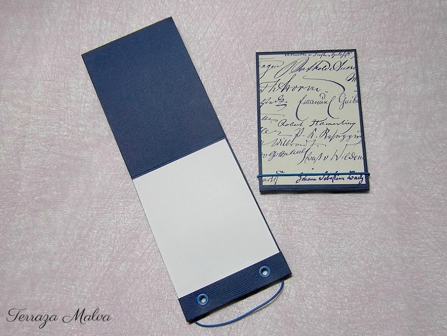 Para la estructura exterior he utilizado unas piezas rectángulares de cartulina texturizada que he plegado a medida de las hojas dejando en la parte inferior una pequeña solapa para colocar unos ojales y las gomitas de cierre. Me gusta el sistema que he usado porque los bordes de las hojas quedan protegidos en el interior de la tapa.