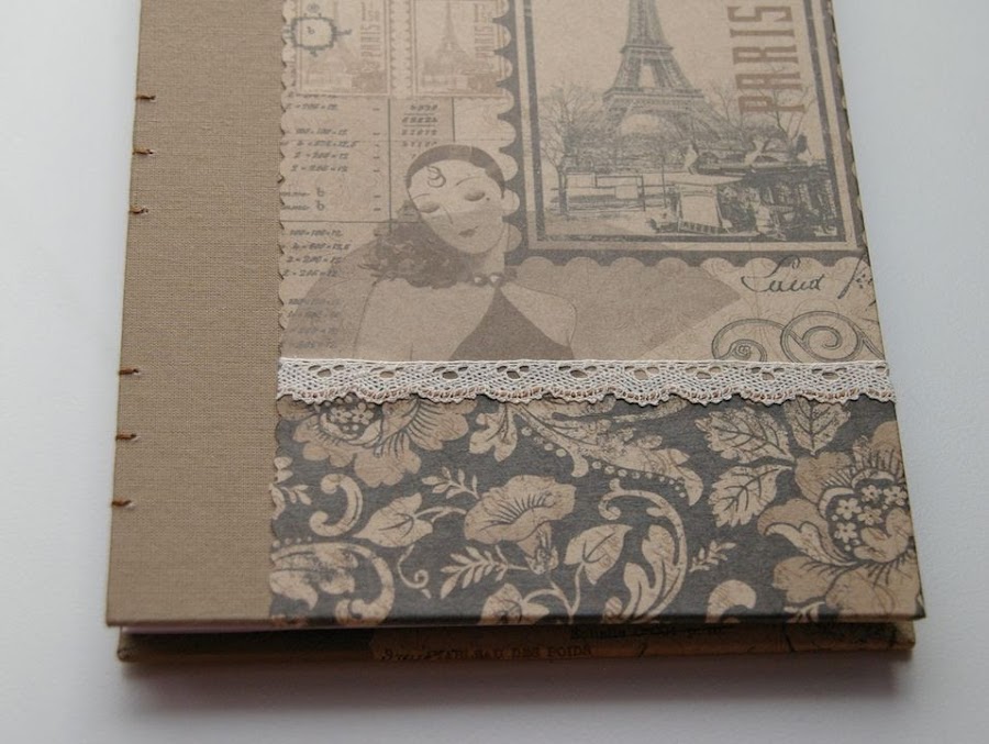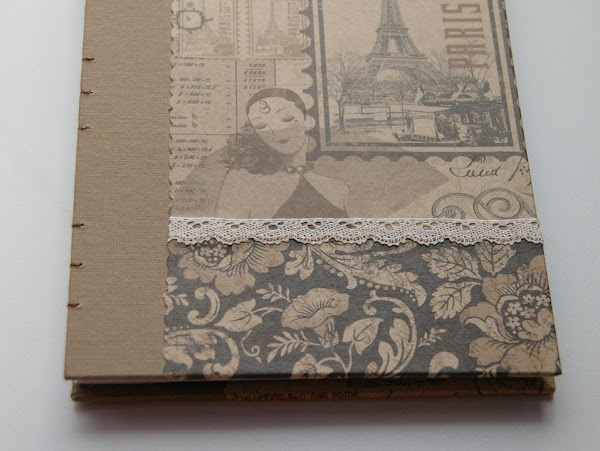 Me encanta alterar libretas!!!Esta es para Vicen en el juego de las sorpresas, elegí unos papeles de graphic-45 una cinta verde para cerrar, un troquelado y un charm parisino, unos brillantitos en verde y ya tengo la portada!!! Para la contraportada use un recortable de la misma colección de papeles con una postal antigua que me encanta, la vuelta de la cinta para cerrar y esta me pareció que no ...