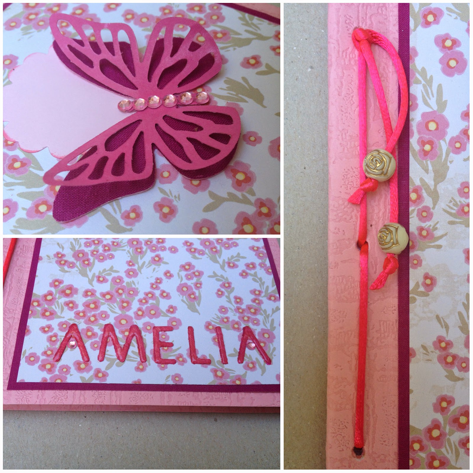 El papel decorado con motivos florales, las bolitas en forma de rosa y la mariposa en superposición, con unos brillantitos que le dan otro acabado.