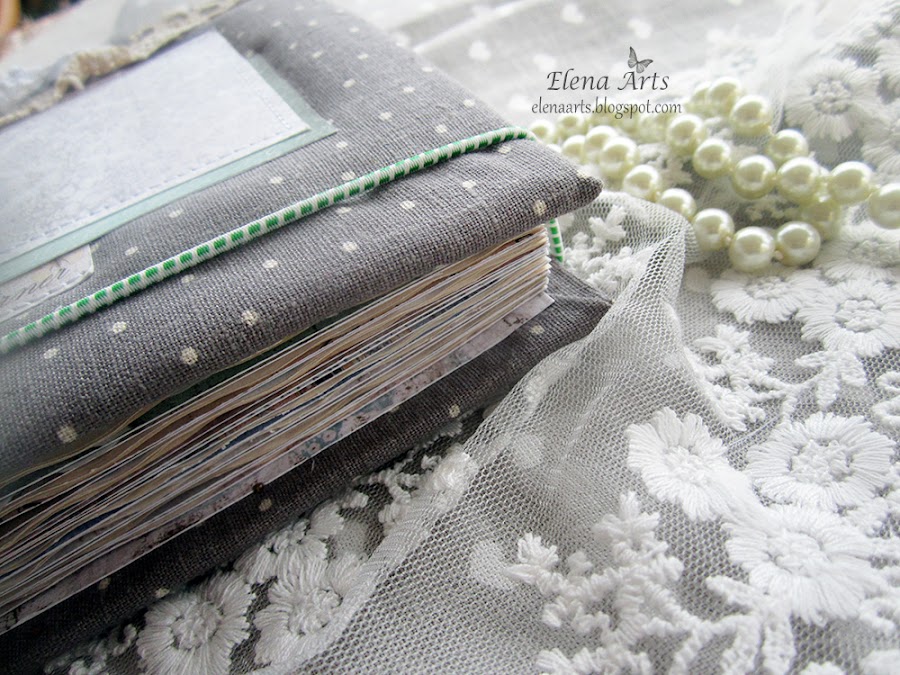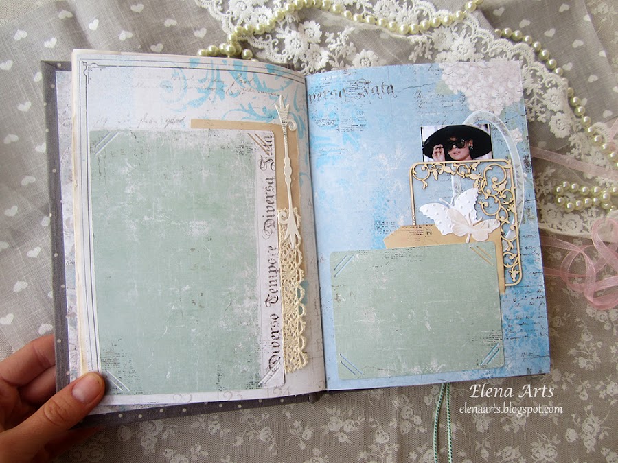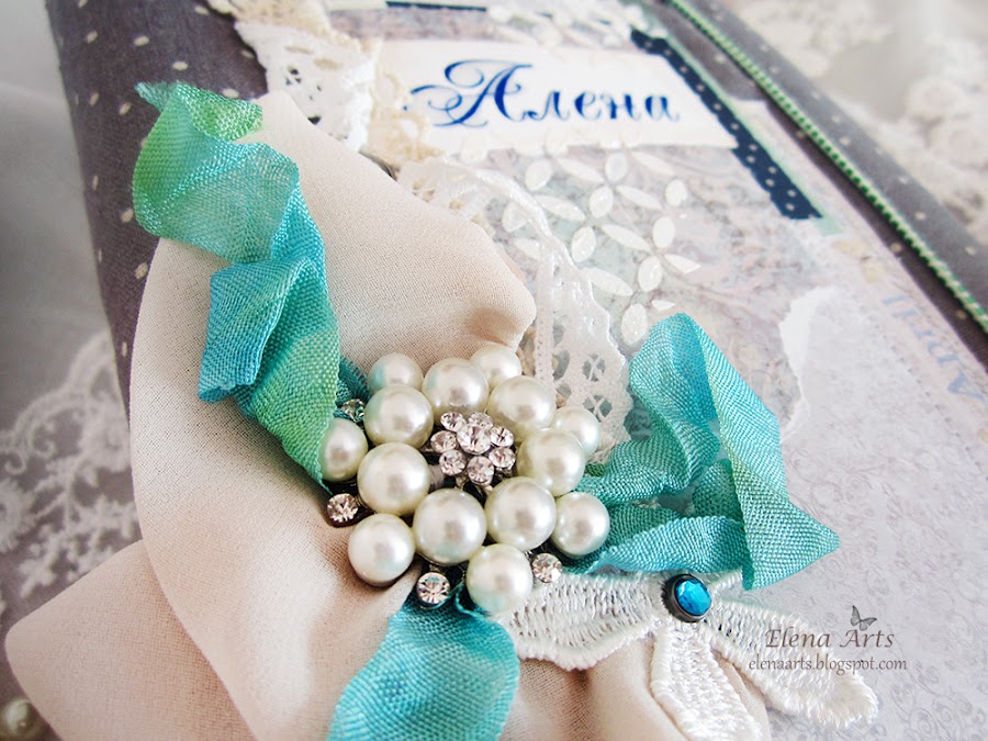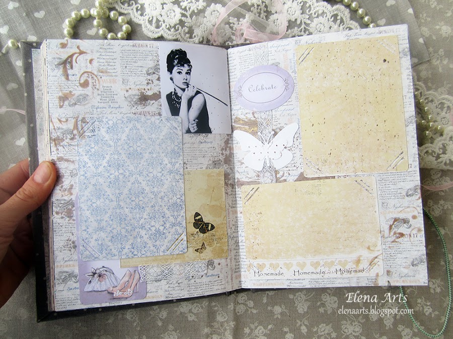The idea was to create a notebook inspired by Audrey Hepburn in "Breakfast with diamonds " and done in the style Shabby Chick or Vintage. So, I put a brooch of pearls and crystals trying to convey elegance, taste and wealth of diamonds ;)