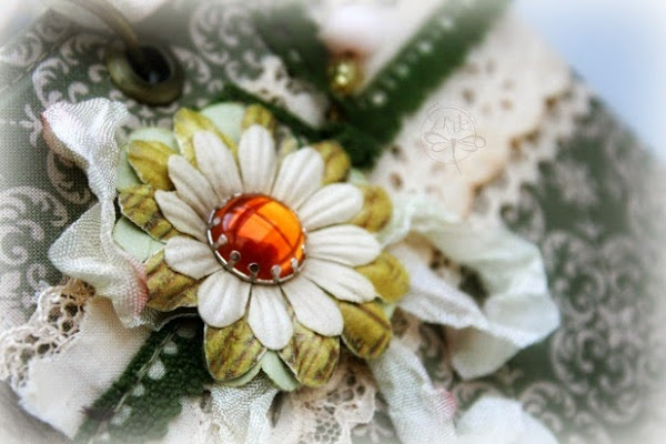 Adoro el resultado!, las telas en tono verde musgo, no necesitaban mucho adorno, pero no pude resistirme a hacerla más de "época" con sus encajes, un alfiler, cintas shabby (pintadas por mi) y una flor...