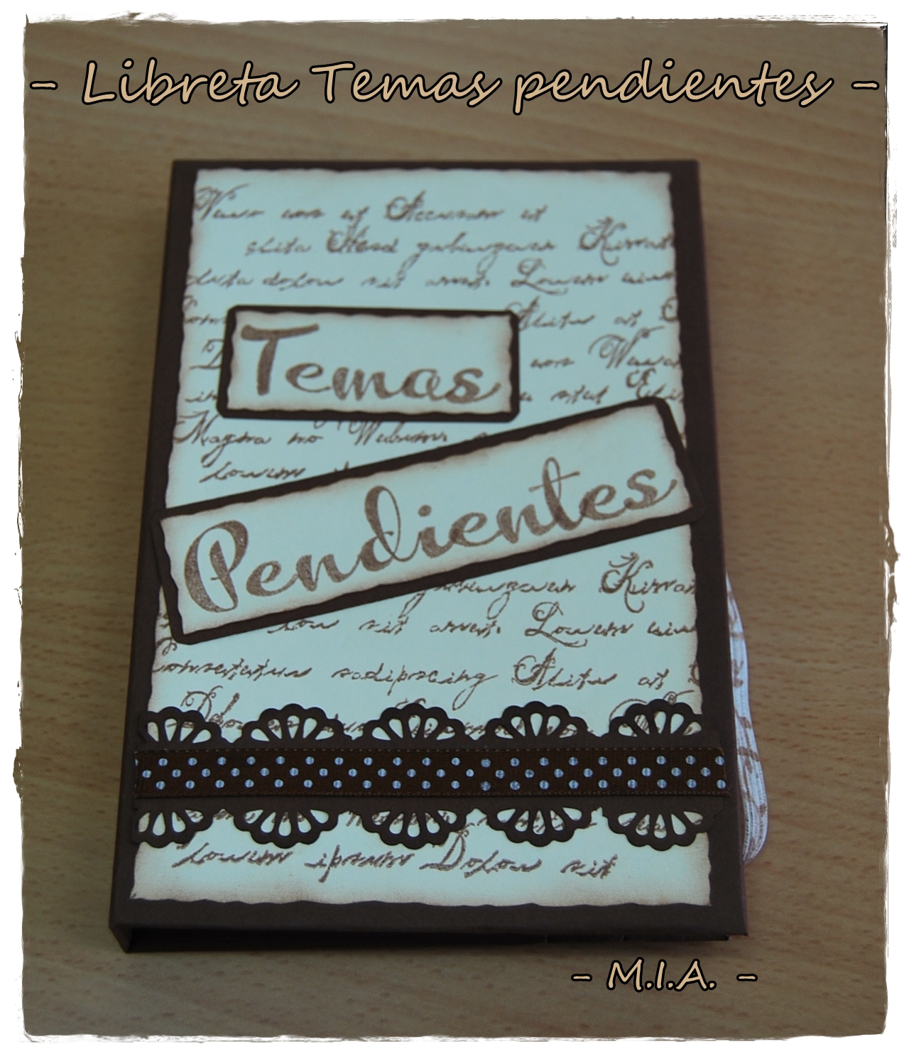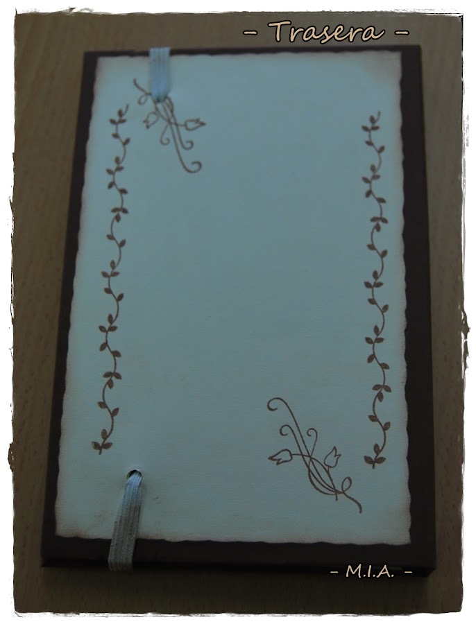 Se parte de un cartón con suficiente grosor para que no se abombe. Yo he hecho primero las tapas, un poco más grandes, y después el interior. He usado cartulinas en colores marrón chocolate y crema, sellos de escritura y de adorno, troqueladora de Marta Steward "Doily lace", un lacito marrón con pequeños lunares y tinta versafine sepia vintage.