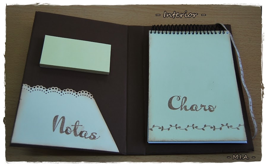 Por dentro... Con un blosillo para guardar notas y un pequeño taco de posit autoadhesivos.
