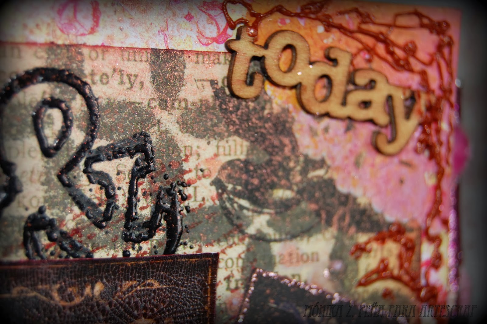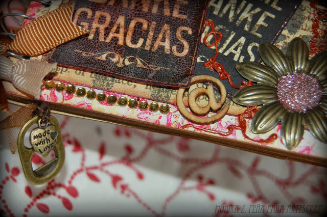 Puse un trocito de blonda entintada en una esquina, un par de adornos de madera, unos cristalitos, la flor de metal, unas gotitas de tinta por ahí y por acá y unos cuantos chorros de una pintura medio seca color cobre que tenía por ahí guardada y que me vino de perlas para el guarreo :P