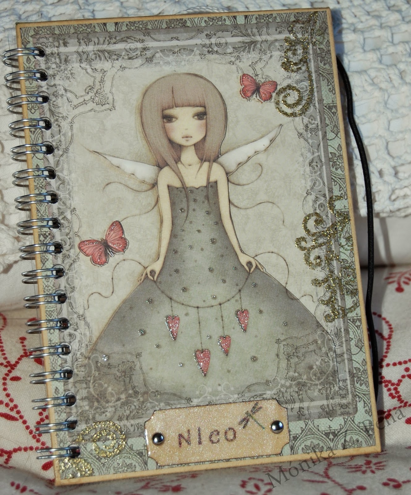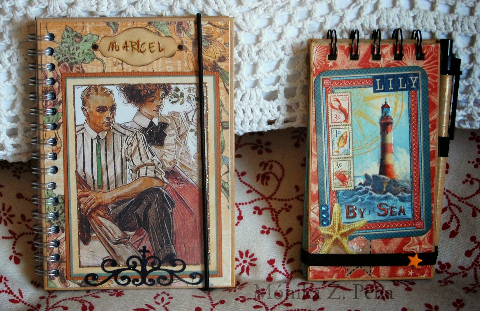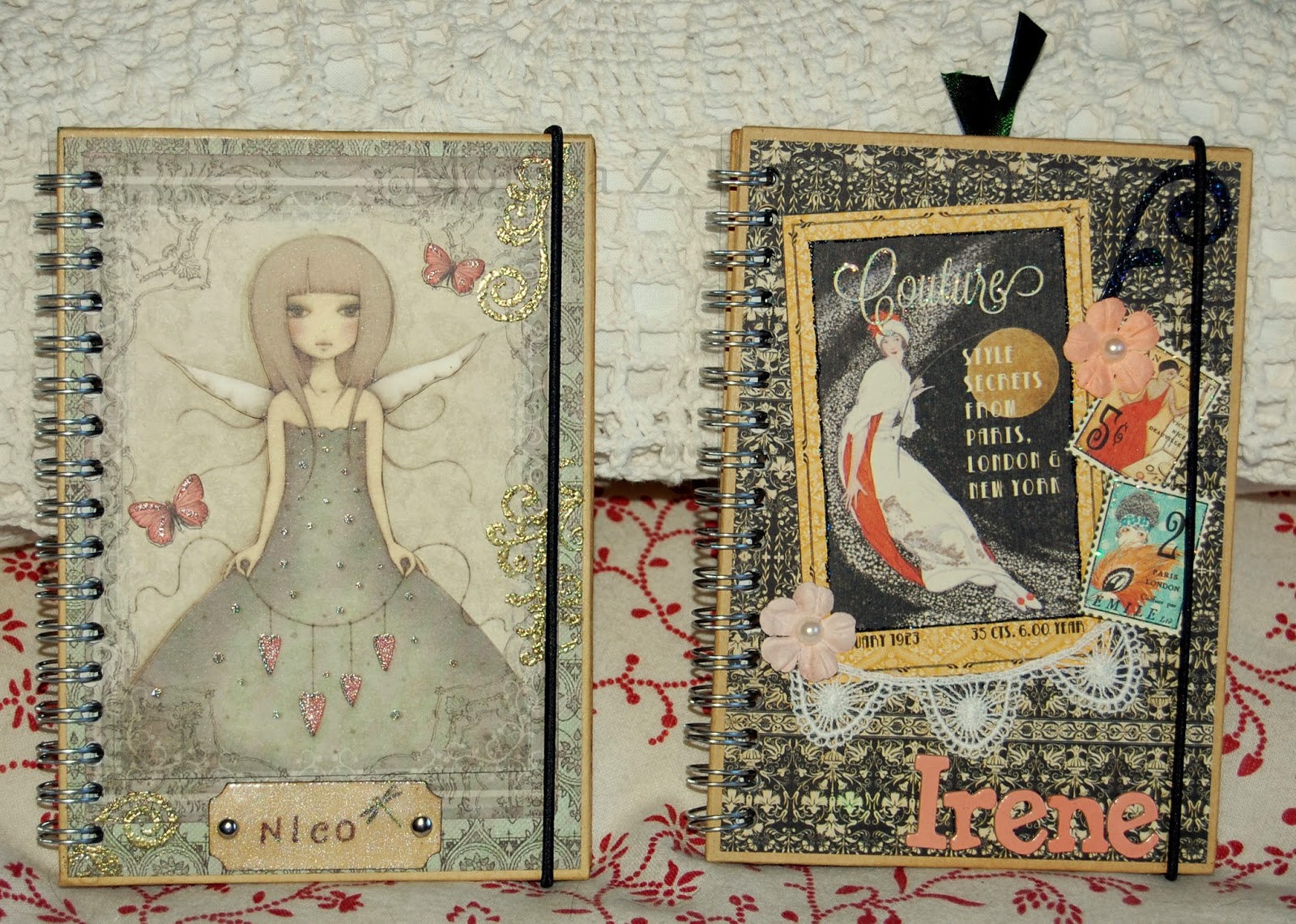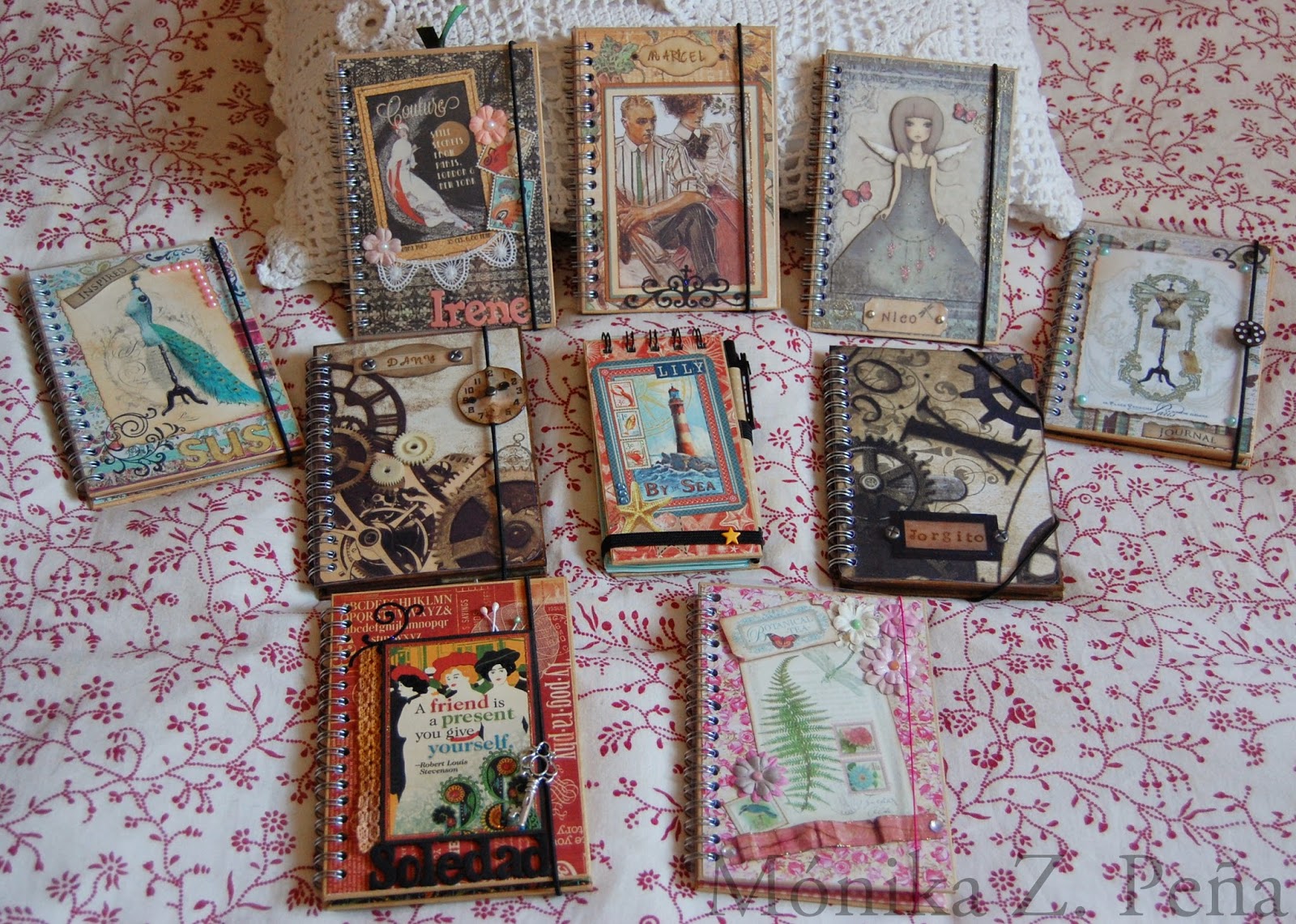 Hay dos para chico y ocho para chica... La mayoría personalizadas con sus nombres. También les añadí cierres de goma para para mantenerlas cerradas y poderlas llevar en el bolso o mochila. Por supuesto, con cubierta de acetato para proteger la portada de roces. Y todas llevan algún tag/etiqueta para que escriba la dedicatória la chica que me las encargó.