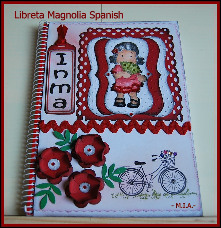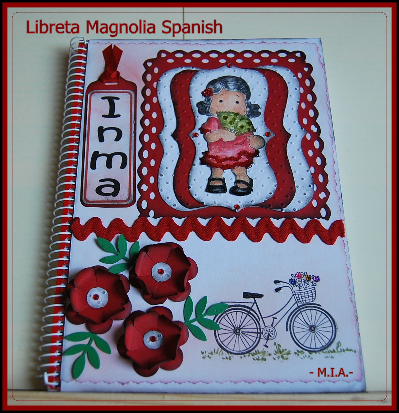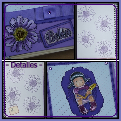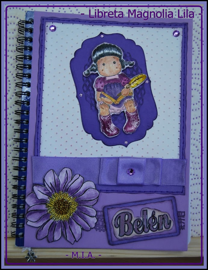Para la segunda libreta elegí el morado y lavanda para el montaje. Esta vez usé la Magnolia Tilda Writing Diary, una de las estampaciones de la quedada scrapera de Diciembre pero que no sé quién la trajo... gracias chicas!!!!!! Coloreada con las tintas distress y con algunos toques de glossy en zapatos, pluma... El troquel es gentileza de Ruth... gracias, preciosa! La flor es un sello coloreado con las mismas tintas y el centro resaltado con glossy acent, al igual que el nombre de la chica. Simulé un falso pespunte por todo el alrededor para realzar el borde. Unos pequeños brillantitos lilas sirven de adorno en las esquinas.