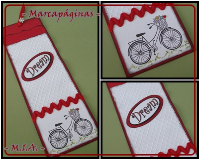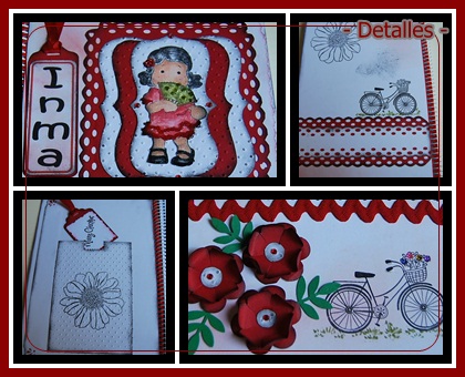 La primera en rojo. La Magnolia Spanish está coloreada con las distress y va montada sobre unos recortes a mano simulando troqueles. El fondo está embosado con la placa de textura de la Big Swiss Dots. Las flores son caseras de la misma cartulina roja. La bicicleta es un sello nuevo que me encanta y que estaba deseando estrenar, no será esta la primera vez que lo use. En el cesto que lleva delante le puse unos pequeños cristales de distintos colores simulando las flores.
