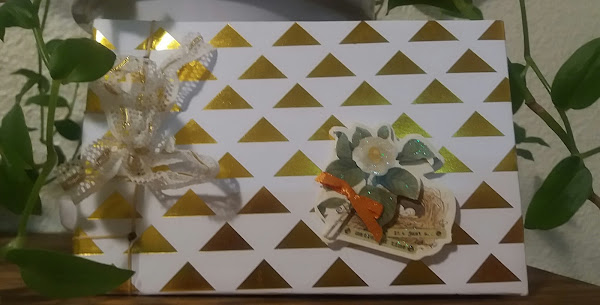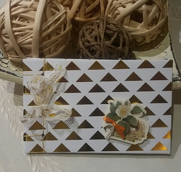 Esta otra libreta con papel dorado de "brilli, brilli", y decorada con una puntilla , una preciosa flor en Tres D y un lacito naranja.