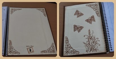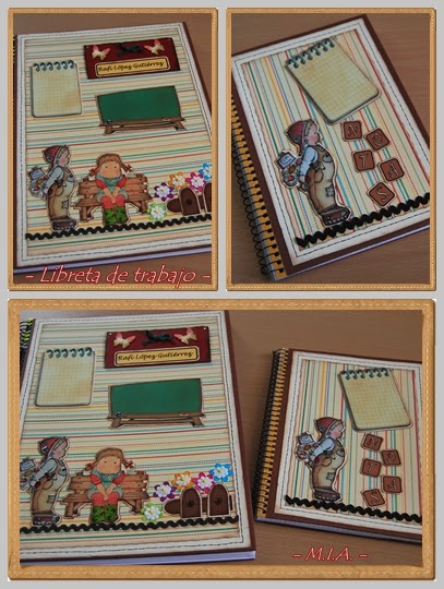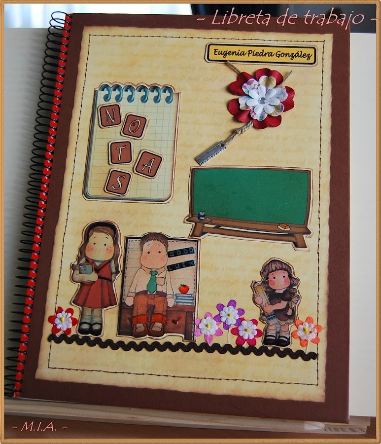Tomando como base una libreta A4 la forré con cartulina marrón y sobre ella un papel de fondo con letras. Puse ondulina marrón simulando el suelo sobre la que pegué las magnolias escolares rodeadas de pequeñas flores. Un bloc sirve para contener las letras de Notas, una pizarra para poner el curso escolar y para terminar unas flores con un charm de una regla terminan los adornos. Bordeando he hecho un cosido simulado en color marrón.